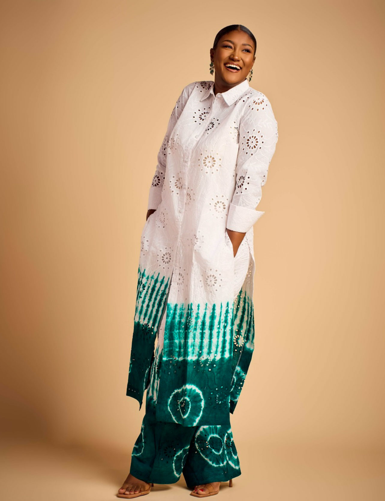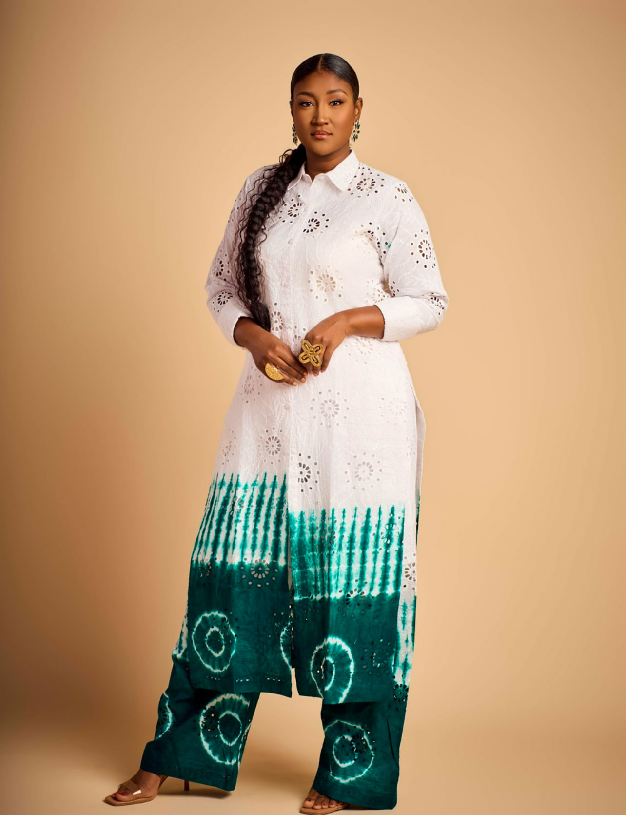 Cristalline est ornée de motifs brodés qui dansent sur un dégradé de teintures vibrantes, évoquant les paysages riches et variés du continent africain. Laissez-vous envoûter par l’harmonie des couleurs et la finesse des détails, pour une allure qui célèbre l’art et la culture africaine avec grâce et sophistication