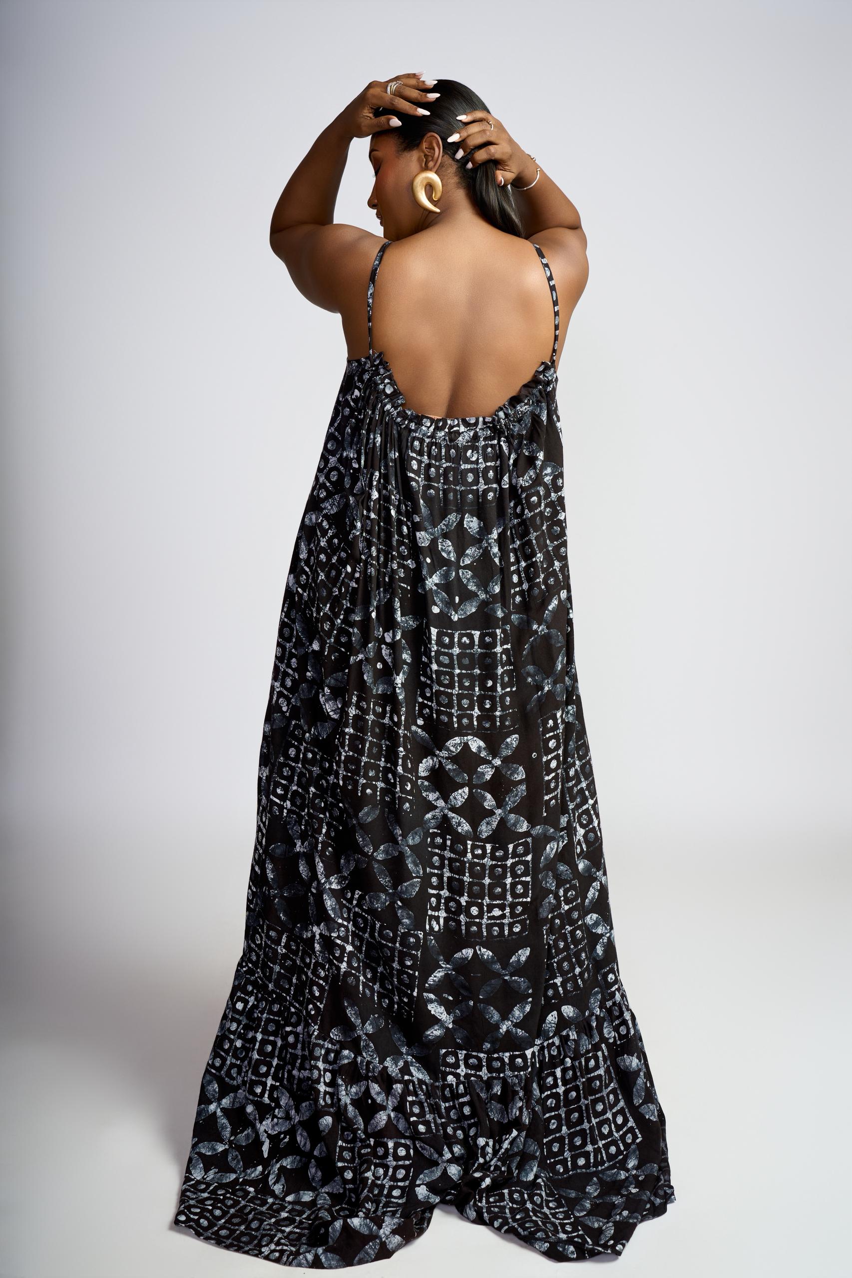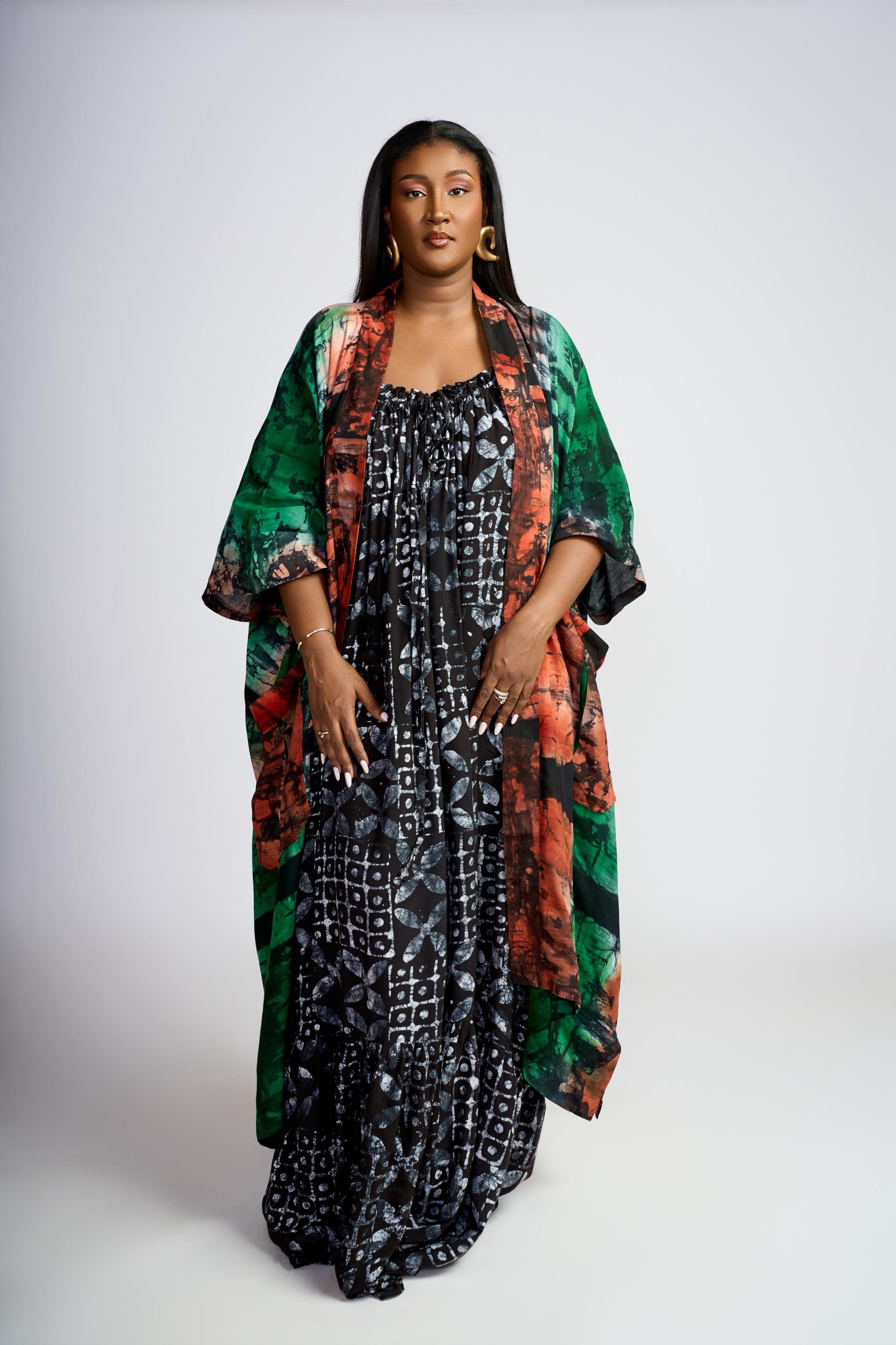 La tenue Lady Empire incarne la grandeur, la liberté et la féminité. Avec sa coupe fluide et majestueuse, ses motifs vibrants en bleu et noir, elle rend hommage à la femme qui affirme sa présence avec douceur et audace.